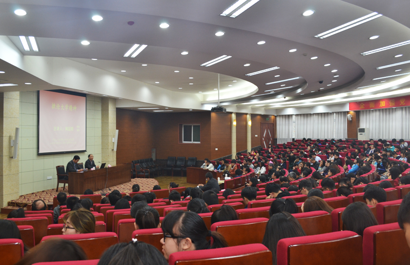 韩教授从大学精神的时代意蕴入手,阐述了守望大学精神、捍卫学术尊严、遏制学术腐败、高扬学者风范的现实意义。随后,韩教授从大学精神的内涵与意义、特征与功能、内容与指向、培育与建设四个方面对大学精神的旨趣作了生动、深入的阐述,韩教授引经据典,旁征博引,对大学之创新精神进行了系统阐释,强调打破思维定势、激活思维灵性的重要性。最后,韩教授从重视强化大学精神家园、科学与人文精神相互渗透、坚守秉承大学理念、推进教育国际化、营造充满人性灵性的校园氛围诸方面阐释了大学精神建设的实践举措。报告风趣幽默,引发阵阵掌声。