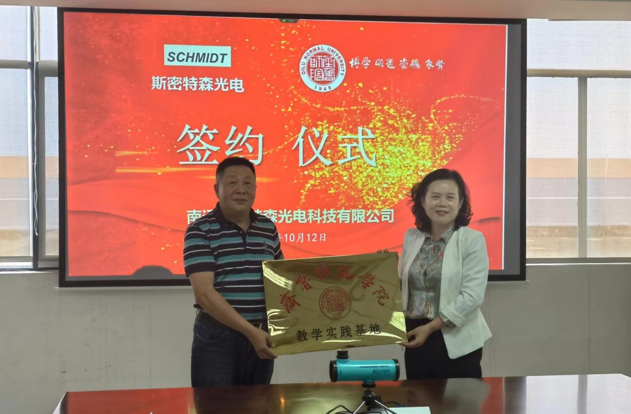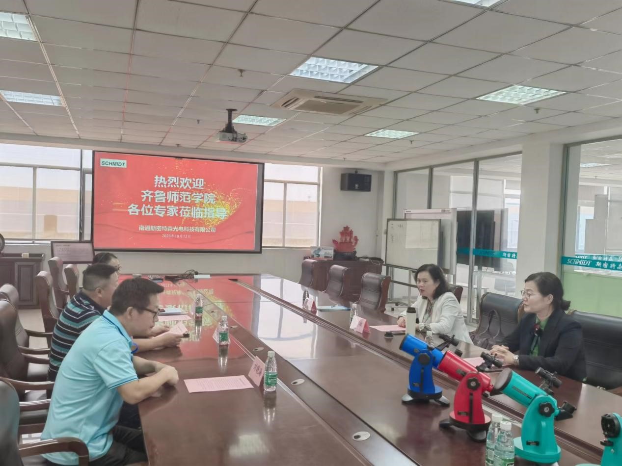 为拓宽毕业生就业资源和渠道,创新人才培养模式,打造产学研教育平台,深度挖掘校企合作。10月12-13日,齐鲁师范学院党委副书记赵敏一行赴江苏省南通斯密特森光电科技有限公司开展交流活动,并举行“齐鲁师范学院教学实践基地”揭牌仪式。斯密特森光电科技有限公司总经理孙玉峰、总工程师刘晓海、办公室主任王小群,物理与电子工程学院院长张洁、党委副书记臧葳参加座谈会。