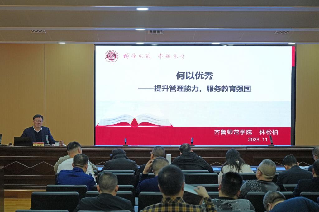 林松柏在致辞中强调,中学校长是引领学校高质量发展、打造区域化高品质学校、推进基础教育改革、助推教育强国战略实施的中坚力量;党组织书记承担着领导基层党支部工作、引领学校教育高质量发展的使命和责任,是推动教育系统基层党建工作质量提升的关键力量。林松柏指出,本项目培训设置了理念引领、名校考察、总结提升、返岗实践四个阶段;在师资配备方面,由来自国内理论研究前沿和教育一线的知名专家学者组成授课团队;在研修内容方面,针对学员需求,设计模块培训;在研修方式方面,安排了专题讲座、小组研讨、学校经验分享、返岗实践等多种形式。林松柏表示,齐鲁师范学院将从适时调整培训计划、凝练培训资源、建立反馈机制、做好培训管理、做好服务保障五个方面组织实施好此次项目培训。