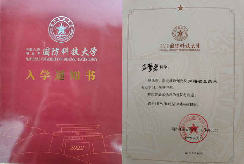 金秋时节,枫叶飘红喜报来。在2022年中国人民解放军院校招生考试中,信息科学与工程学院2020级计算机网络技术专业学生左梦君以优异成绩被中国人民解放军国防科技大学录取,成功将个人之“志”融入强军强国的时代需要。