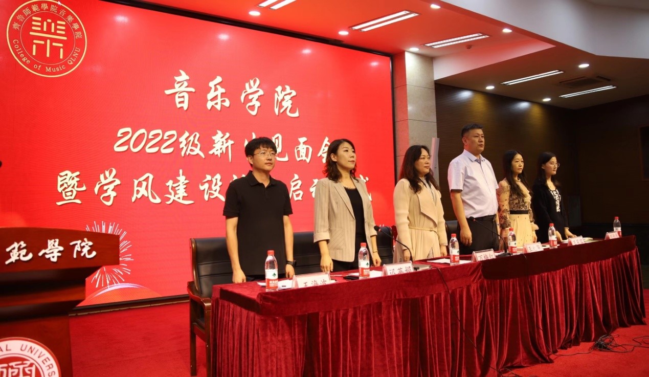 9月22日下午,音乐学院2022级新生见面会暨学风建设活动启动仪式在图书馆学术报告厅举行。音乐学院党委书记王允华、院长万梅红、党委副书记迟英娟、办公室主任王笑容、团总支书记王海波、团总支副书记刘秋雨、全体辅导员、新生班主任以及2022级333名新生参加了见面会。会议由迟英娟主持。