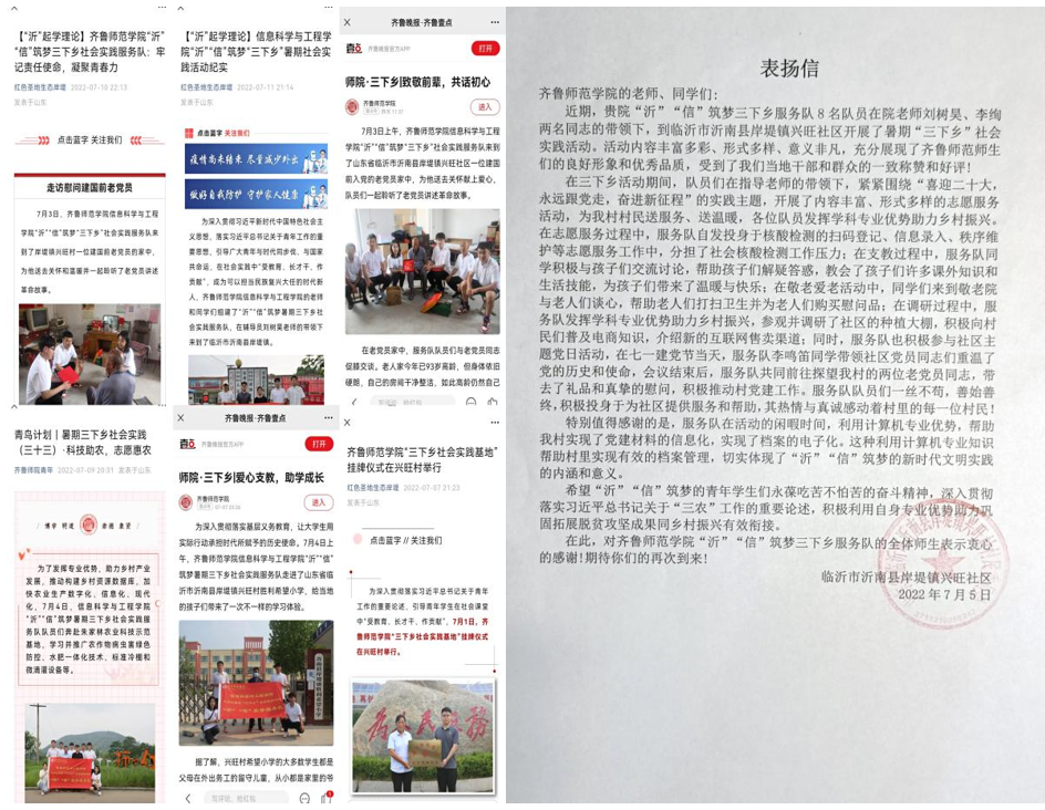 齐鲁师范学院信息科学与工程学院“沂”“信”筑梦暑期三下乡社会实践服务队队员们在这个假期走出校门、走进社会、深入基层,充分发挥专业优势,通过一系列有意义的实践活动来不断提高自身的创新能力、学习能力和专业素养。本次开展的实践活动收到了来自临沂市沂南县岸堤镇兴旺社区发来的表扬信,并引起了齐鲁壹点、红色圣地生态岸堤等媒体的广泛关注,产生了良好的社会反响,赢得了社会各界的广泛赞誉。