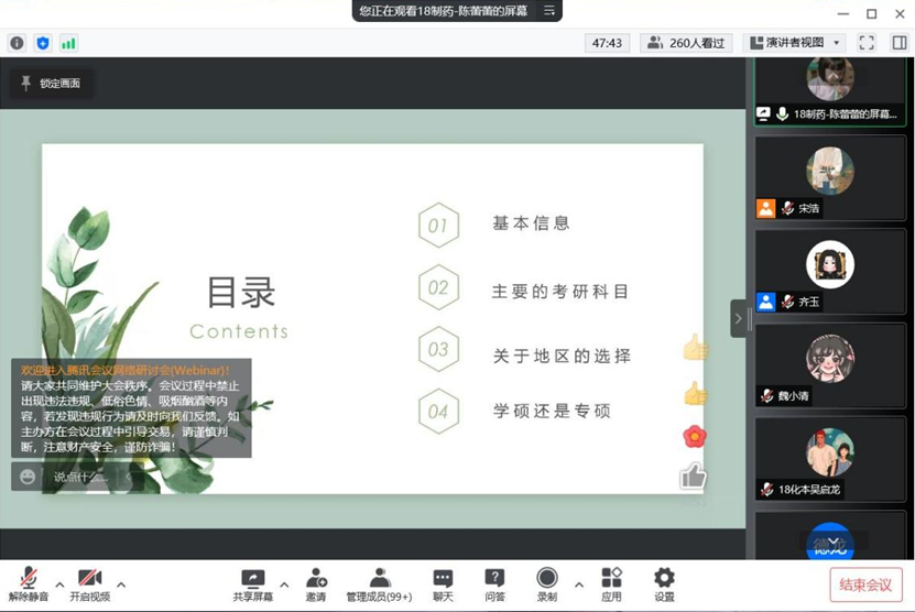 为深入学习贯彻落实习近平总书记关于青年工作的重要思想,充分发挥优秀学生的示范引领作用,帮助学生有效明确目标、获取信息、积累经验、调整心态,化学与化工学院始终坚持为学生办实事、办好事的宗旨,依托“化院青年说”特色品牌活动,在5月7日下午通过腾讯会议成功举办了“芳华灼灼映初心,‘研’路生花逐梦行”考研经验交流会。化学与化工学院副院长刘新征,七位优秀考研学生代表吴启龙、马德龙、王晓晴、韩静、国颖、陈蕾蕾、曹燕玉,2019级、2020级、2021级本科生参加了此次活动。