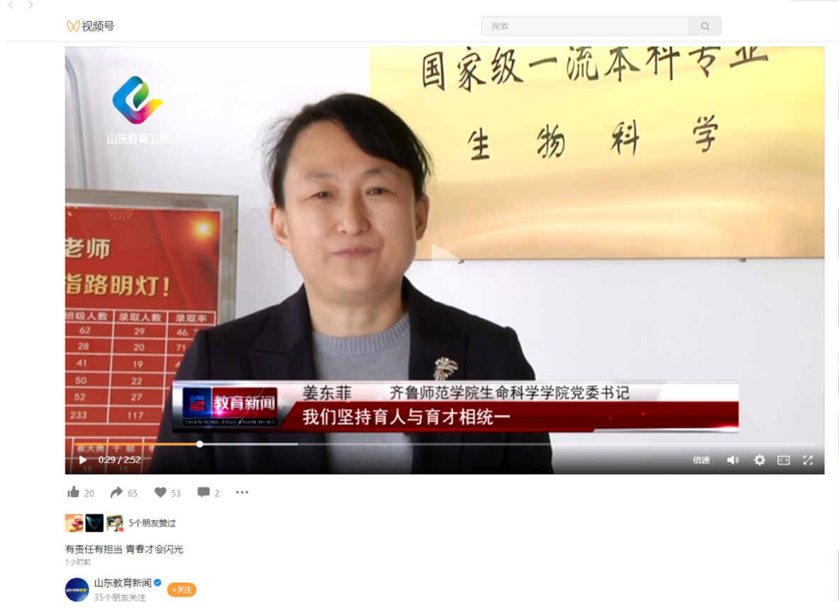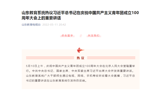 5月10日上午,庆祝中国共产主义青年团成立100周年大会在北京人民大会堂隆重举行,习近平总书记代表党中央发表重要讲话。为培养师生的政治意识,提高师生的思想觉悟,激发师生的爱国热情,生命科学学院党委组织学院全体师生以线上线下相结合的形式共同收看庆祝中国共产主义青年团成立100周年大会直播。直播后召开了生命科学学院庆祝中国共产主义青年团成立100周年座谈会,认真学习领会习近平总书记在庆祝中国共产主义青年团成立100周年大会上的重要讲话。山东省教育电视台报道了学院学习情况,党委书记姜东菲接受采访,采访内容同步在山东教育电视台官微发布。