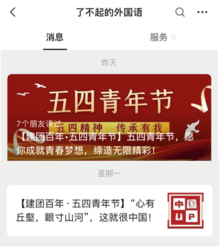 外国语学院微信公众号发布了建团百年系列内容,让同学们重回103年前,回到那个动荡的历史时刻,感受青年的力量,感受青年与祖国未来的息息相关。五四精神,传承有我。