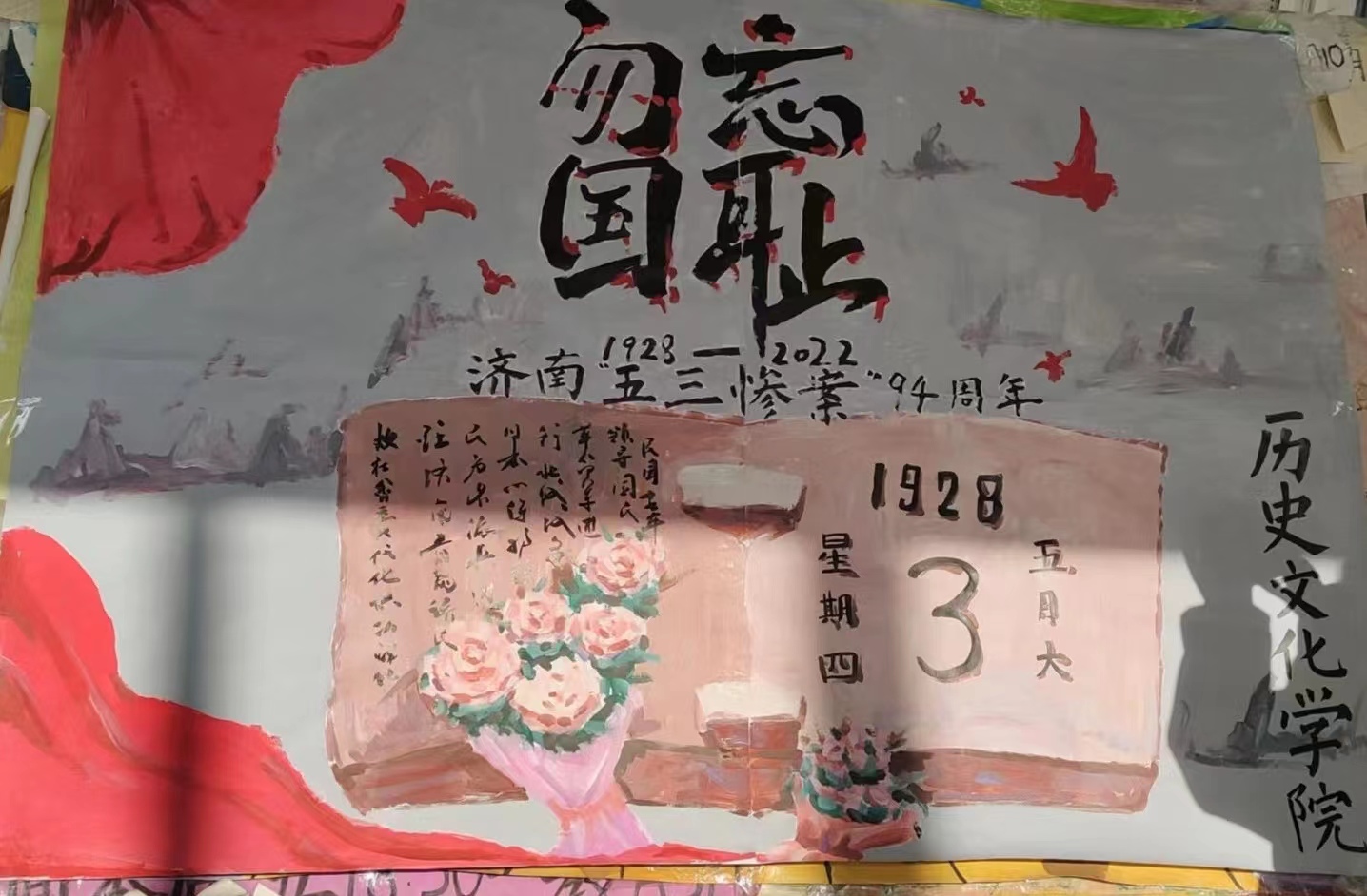 为祭奠“五三惨案”死难者,缅怀革命先烈,警示当代大学生居安思危、勿忘国耻、警钟长鸣,提高大学生忧患意识,增强国防观念与爱国情怀,历史文化学院于5月3日下午在二号教学楼B406会议室举办了“五三惨案”悼念活动。此次活动由辅导员徐超主持,团总支书记宋高娃以及学院全体学生代表参与线上默哀活动。