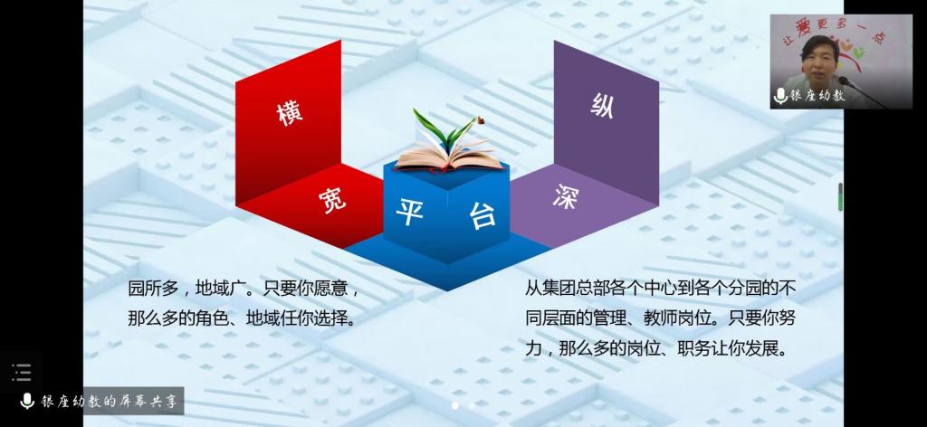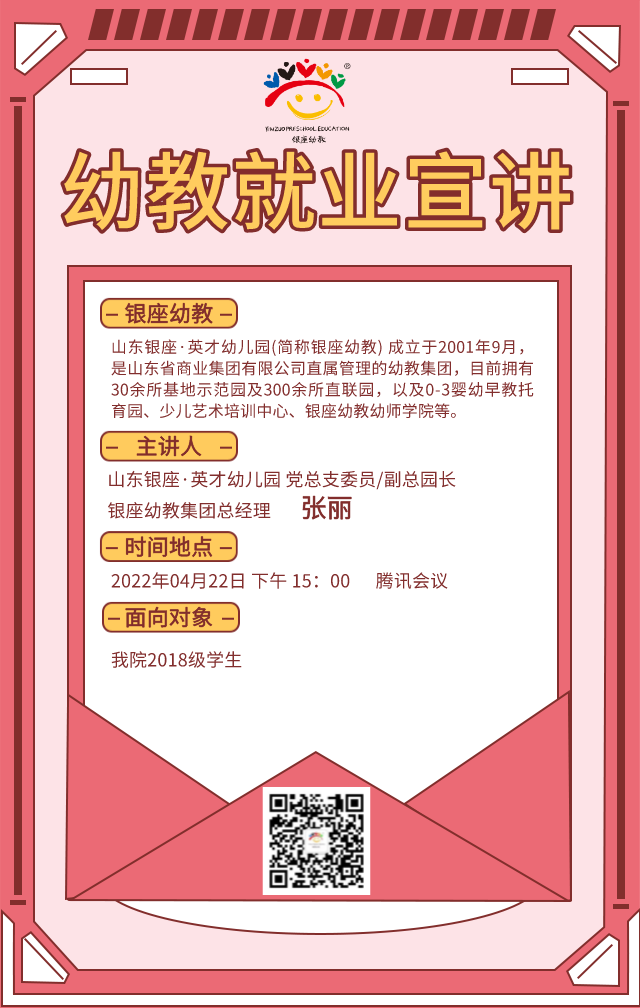 4月22日下午,学前教育学院邀请山东银座·英才幼儿园党总支委员、副园长张丽老师为毕业生进行线上幼教就业宣讲。学前教育学院党总支书记郑海斌,教师刘肖君、杨斌、臧悦怡、林芳作为嘉宾出席本次宣讲会,2018级全体学生参加本次宣讲会。