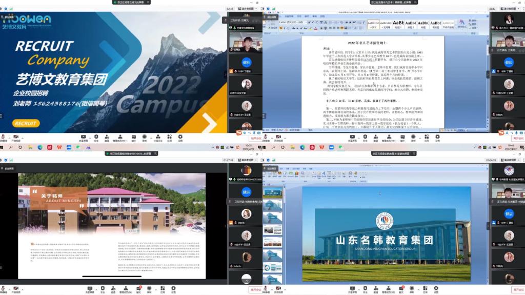 会议伊始,音乐学院毕业班辅导员王海波向用人单位简要介绍了学院的办学特色、办学定位、人才培养模式及学院2022届毕业生整体情况。本次专场招聘会共有济南市历下区铭师教育培训学校、济南市市中区艺博文教育培训学校、山东名韩教育信息集团有限公司、威海非凡少儿艺术培训中心4家企业抛出“橄榄枝”,在招职位50余个,为广大音乐学、舞蹈学专业毕业生就业打造了一个良好、坚实的就业平台,提供了大量优质就业岗位。考虑到疫情防控现状,本次招聘会采取网络招聘形式开展,同学们只需线上投送简历,极大程度的减少了同学们寻找岗位中的困难。