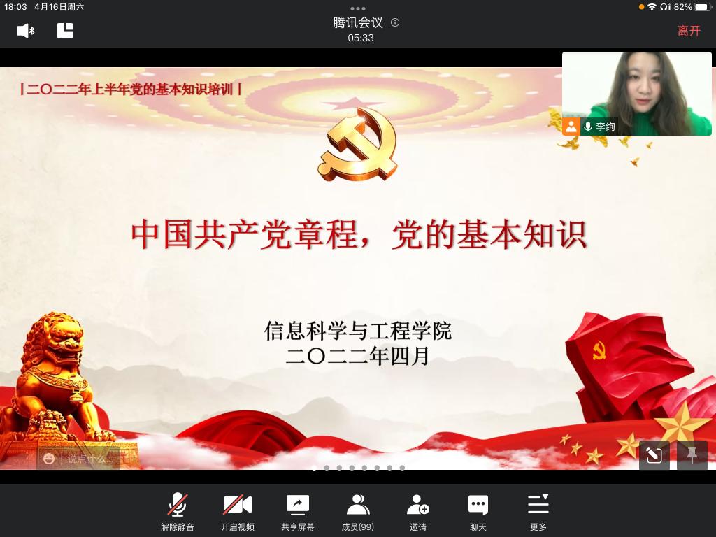 为切实加强入党积极分子的教育培养,提升党性修养,把好党员发展的“入口关”,4月16日至21日,信息科学与工程学院举行了2022年上半年入党积极分子培训,此次培训通过腾讯会议平台线上开展。学院党总支书记赵青、副书记梁晨,团总支副书记李绚,辅导员老师们分别担任主讲,学院95名入党积极分子参加。