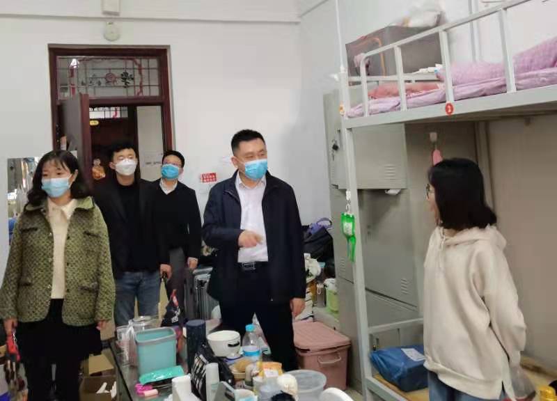为深入了解新学期学生返校后整体情况,及时关注疫情期间学生返校后的思想动态,切实做好学生宿舍安全隐患排查工作,3月8日下午,外国语学院党总支书记于江,党总支副书记栾毅之,团总支书记牛荦,辅导员王伟、刘欣欣到学生宿舍,开展新学期宿舍安全检查及疫情防控工作。