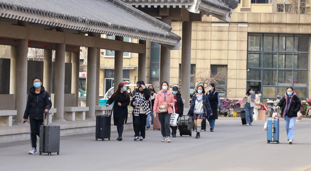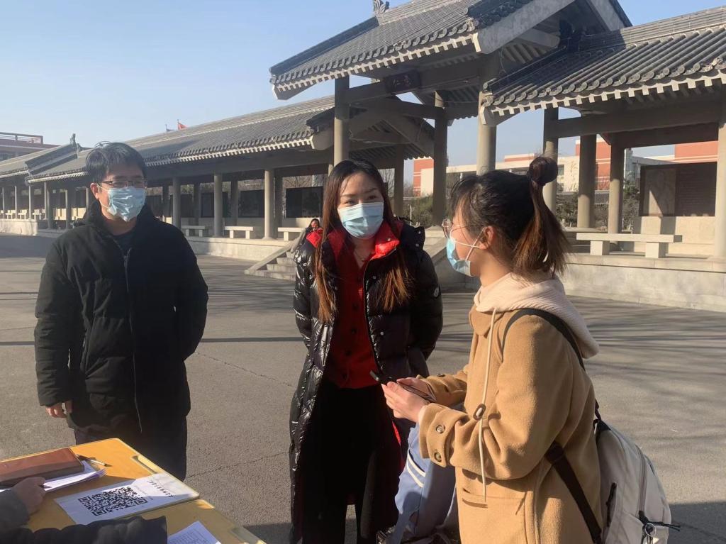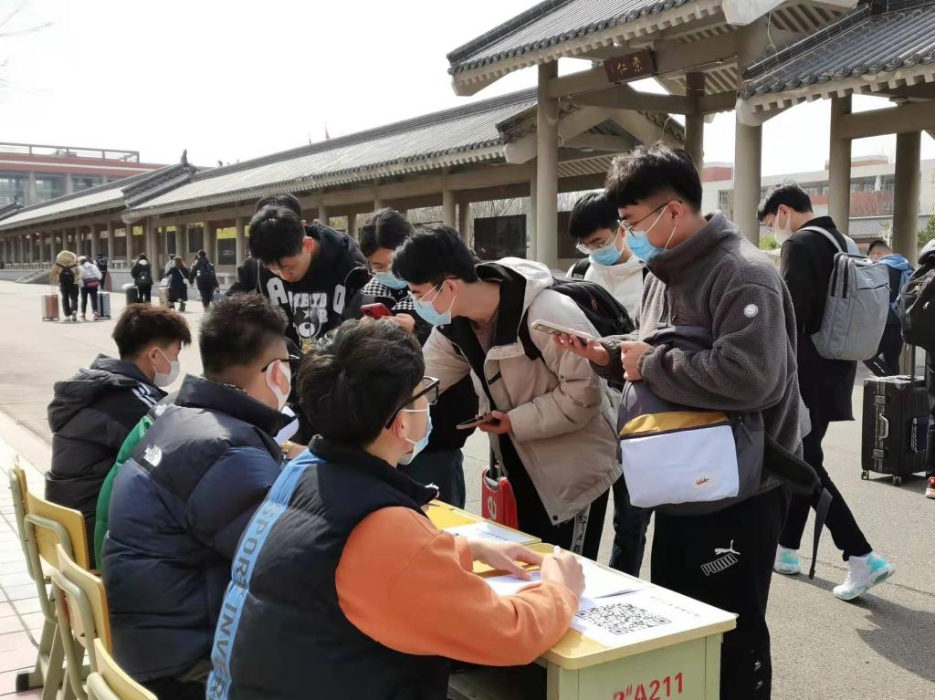 3月5日清晨,学院团总支书记李华带领其余四名辅导员在文化长廊东侧为省外返校学生登记、扫码、解答问题。3月6日,学生会的工作人员一早便到达现场,二维码、登记表格的准备也已就绪。迎接返校的师生往来奔走、热情洋溢,大大提高了报道效率,避免了人群聚集,减少了排队等待的时间。