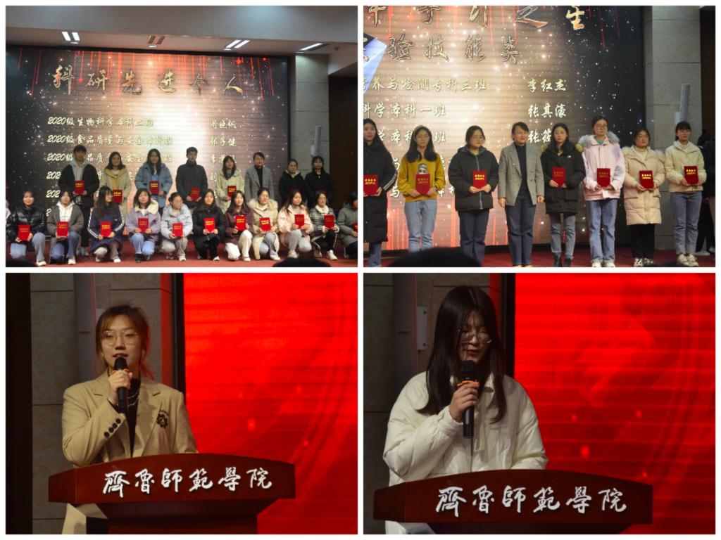 2021年度,学院涌现出一大批团结奋进的先进集体和德才兼备的优秀个人。近百名同学获得生命科学学院2021年抗疫工作先进个人、生命科学学院2021年优秀班集体、生命科学学院2021年学团活动积极分子、生命科学学院2021年文明宿舍、生命科学学院2021年管理服务先进个人、生命科学学院2021年学生科研先进个人、生命科学学院2021年学习之星【外语类】、生命科学学院2021年学习之星【学业类】、生命科学学院2021年学习之星【文体类】、生命科学学院2021年学习之星【实验技能类】、生命科学学院2021年学习之星【师范技能类】、生命科学学院2021年学习之星【综合类】的光荣称号。参会领导和老师为受表彰集体和个人颁发获奖证书并合影留念。颁奖环节结束后,学习之星代表胡一寒同学进行发言,从自律即自由、讲究高效学习、寻找外驱力三个方面分享了学习经验,并代表全体同学向所有老师表达诚挚的感谢。科研先进个人代表闫宇欣同学的发言中,她谈到创新的重要性和青年一代的责任与担当,她将不忘初心、继续前行。