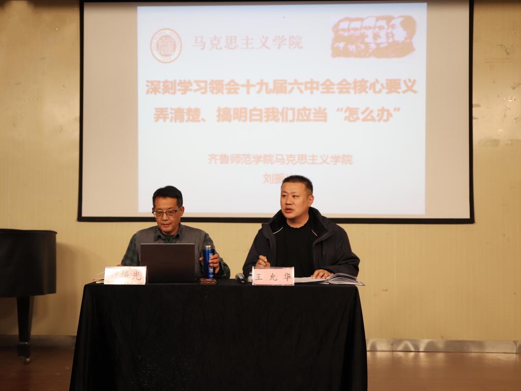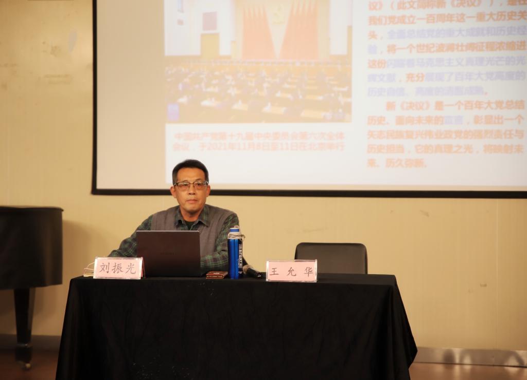 为深入学习和领会党的十九届六中全会的重大意义,12月23日下午,音乐学院邀请马克思主义学院刘振光教授,在音乐厅开展“深刻学习领会党的十九届六中全会核心要义,弄清楚、搞明白我们应当“怎么办”的专题学习报告。音乐学院全体教师、全体学生党员参加了本次专题学习,会议由党总支书记王允华主持。