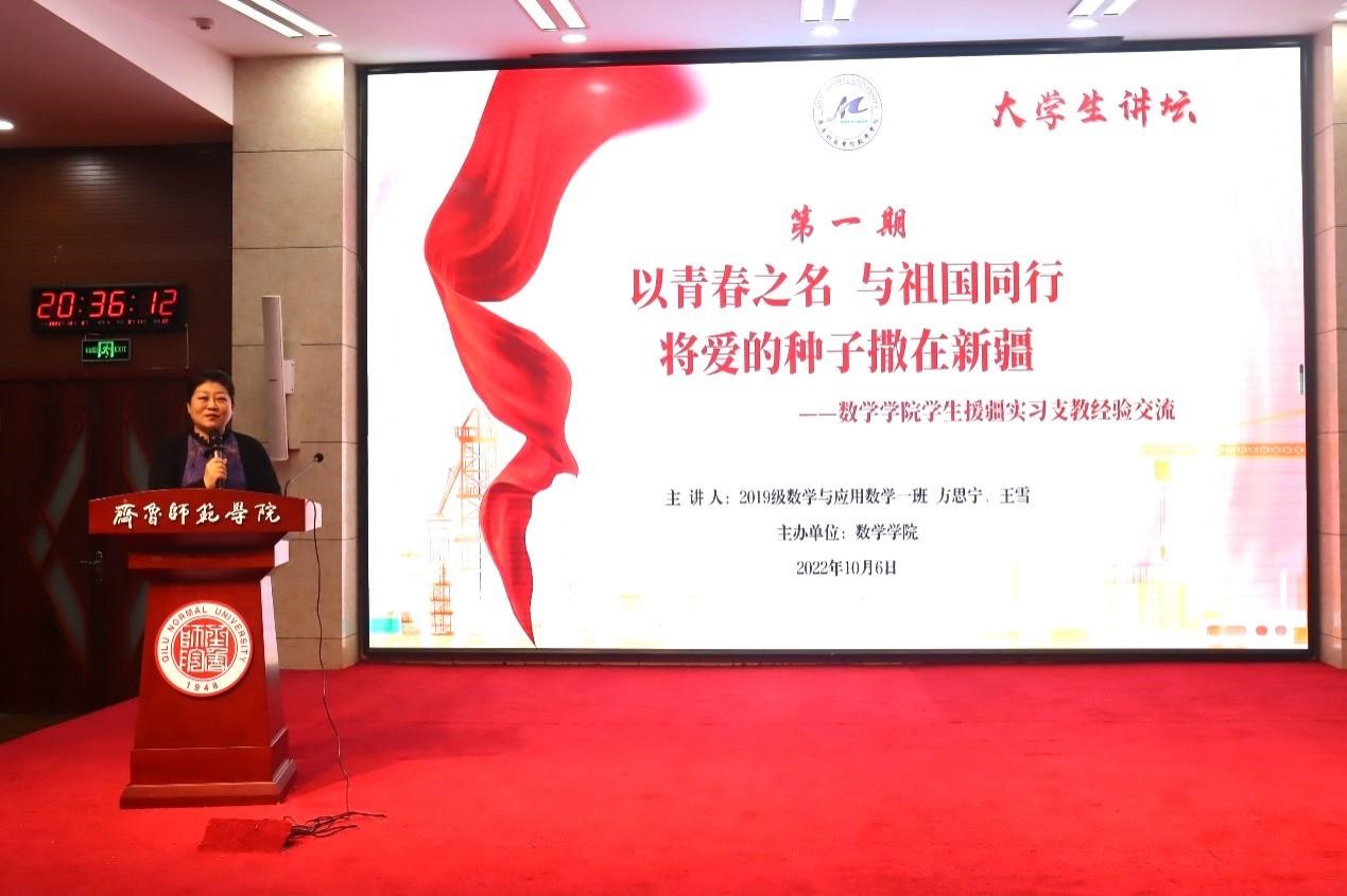 10月6日,数学学院主办的大学生讲坛第一期在章丘校区图书馆学术报告厅开讲,讲坛由数学学院党委副书记初益辰主持。2022年春季援疆支教团的援疆学生代表担任主讲嘉宾,2020级、2021级数学专业全体同学参加了此次讲坛。
