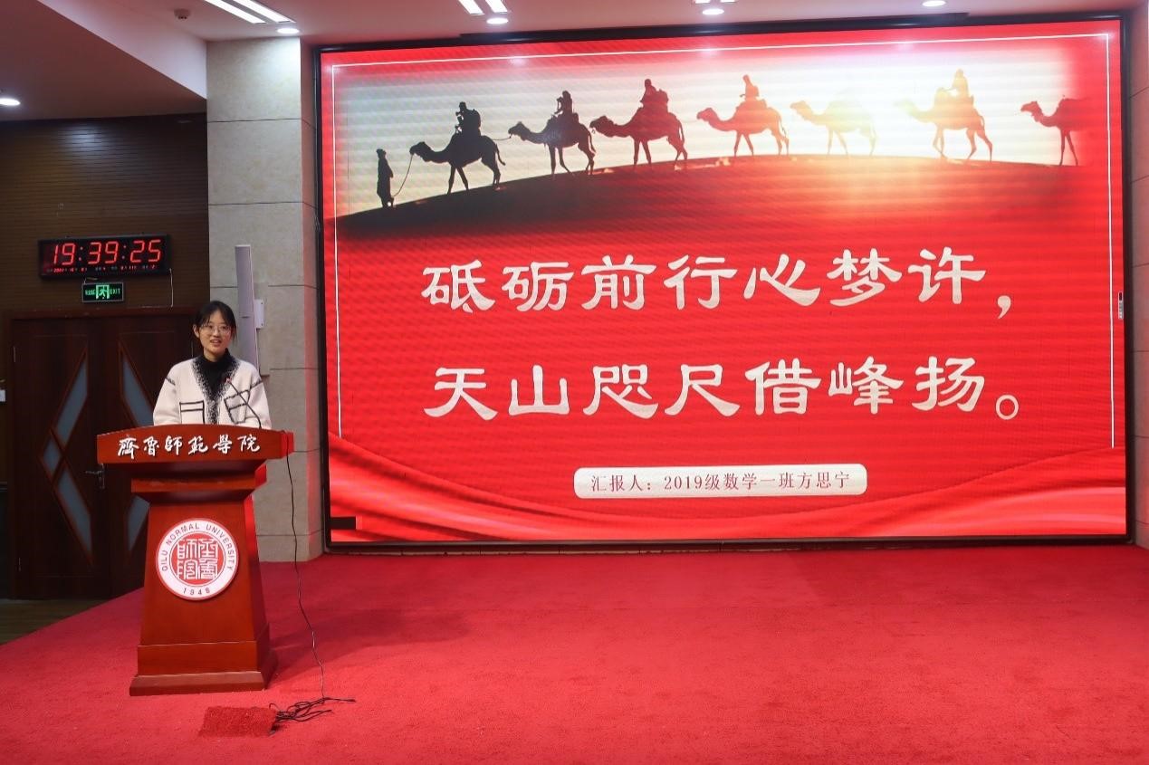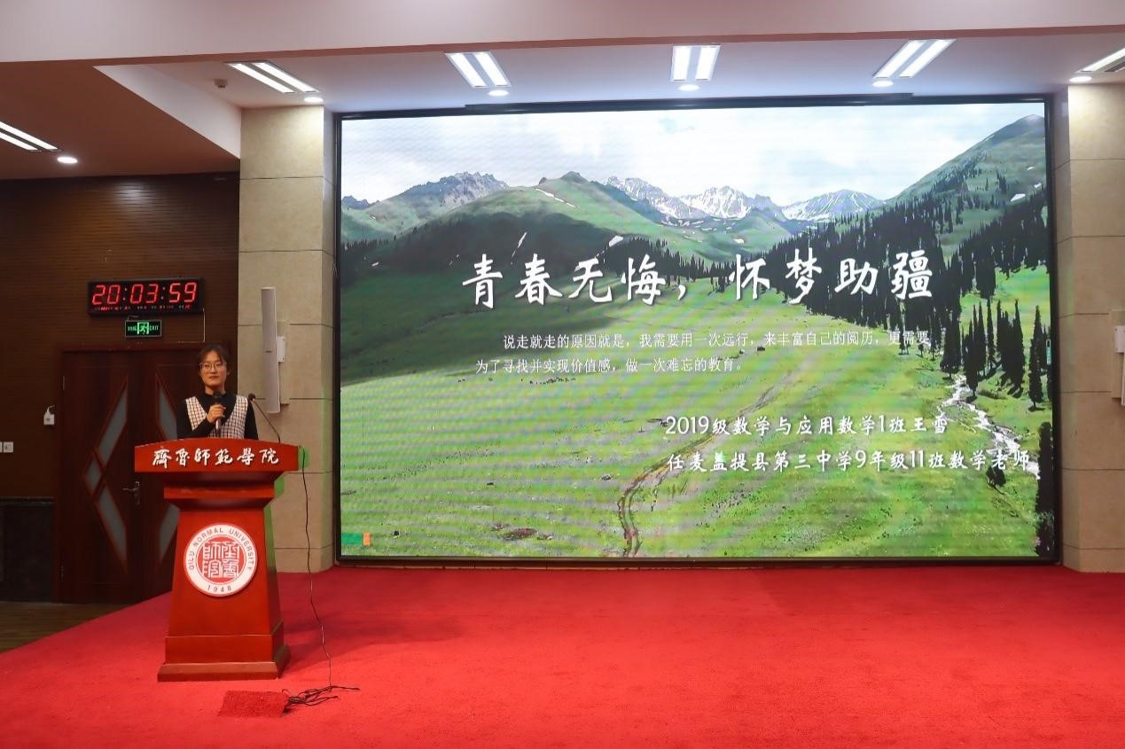 首期讲坛以“以青春之名,与祖国同行,将爱的种子撒在新疆”作为主题, 2019级数学与应用数学专业方思宁、王雪两位支教学生代表进行了发言。方思宁、王雪为代表的援疆执教学生积极响应党和国家的号召,远赴祖国边疆进行支教,在实践中认识自己,在实践中磨砺,在实践中成长,在实践中锤炼本领,更是在实践中对教师这一神圣的职业有了更加深刻的理解,用实际行动践行着“请党放心,强国有我”的青春誓言。他们热情饱满的工作状态,既赢得了实习支教学校领导老师们的一致好评,也充分展现了师院学子在祖国西部边陲砥砺奋进、顽强拼搏,用真心教育,用真情奉献的支教情怀。
