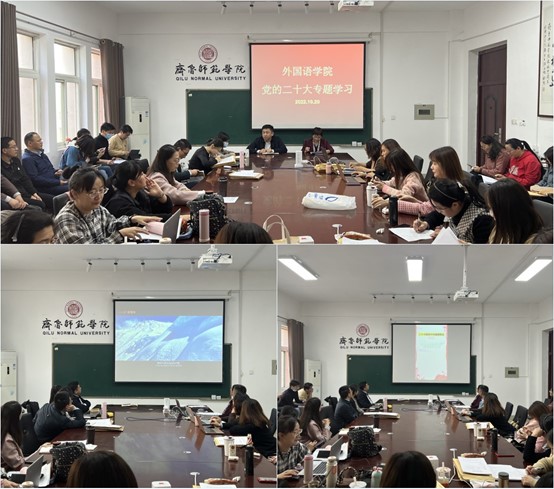 会上,利用“学习强国”平台视频学习习近平总书记在参加党的二十大广西代表团讨论时的重要讲话精神,教师第一、第二党支部书记和学生第一、第二党支部书记石磊、张力文、牛荦、王伟分别领学了新华社和求是网有关党的二十大报告的社论文章,并结合学院专业特点别开生面的进行了双语学习,通过集体观看“中国共产党国际形象网宣片《CPC》”和CHINA DAILY制作的“党的二十大报告中的重要概念双语版”,使得政治理论学习与专业素养提升相结合,在进行政治理论学习的同时增加专业知识的学习与交流,启发老师们对如何培养能讲好中国故事的国际化外语人才,更好讲好中国故事、传播好中国声音进行思考。