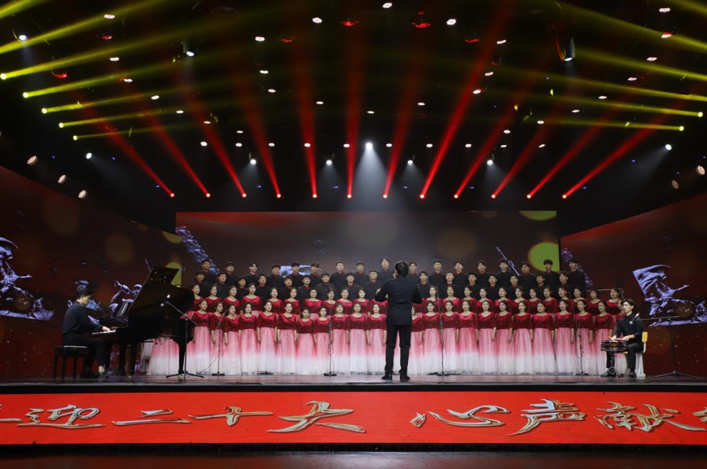 在本次合唱接力活动中,我校音乐学院合唱团压轴演唱了新编版《没有共产党就没有新中国》,旋律慷慨激昂,歌声催人奋进,唱出了中华儿女对改革开放取得的成绩的衷心赞美,唱出了对党和祖国的无限热爱,唱出了慷慨激昂的民族自豪感,展现了我校学生朝气蓬勃、奋发进取的精神面貌。