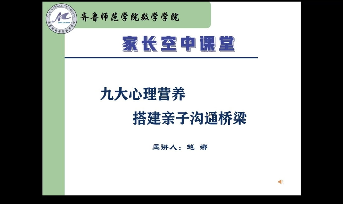 12月10日,数学学院首期家长空中课堂开课。本次课堂以“九大心理营养 搭建亲子沟通桥梁”为主题,邀请国家二级心理咨询师、衡水市共青团青少年维权团队心理专家、河北省“美丽庭院”宣讲团讲师赵娜担任主讲嘉宾。数学学院党委副书记初益辰主持活动,全体辅导员以及百余位家长参加活动。