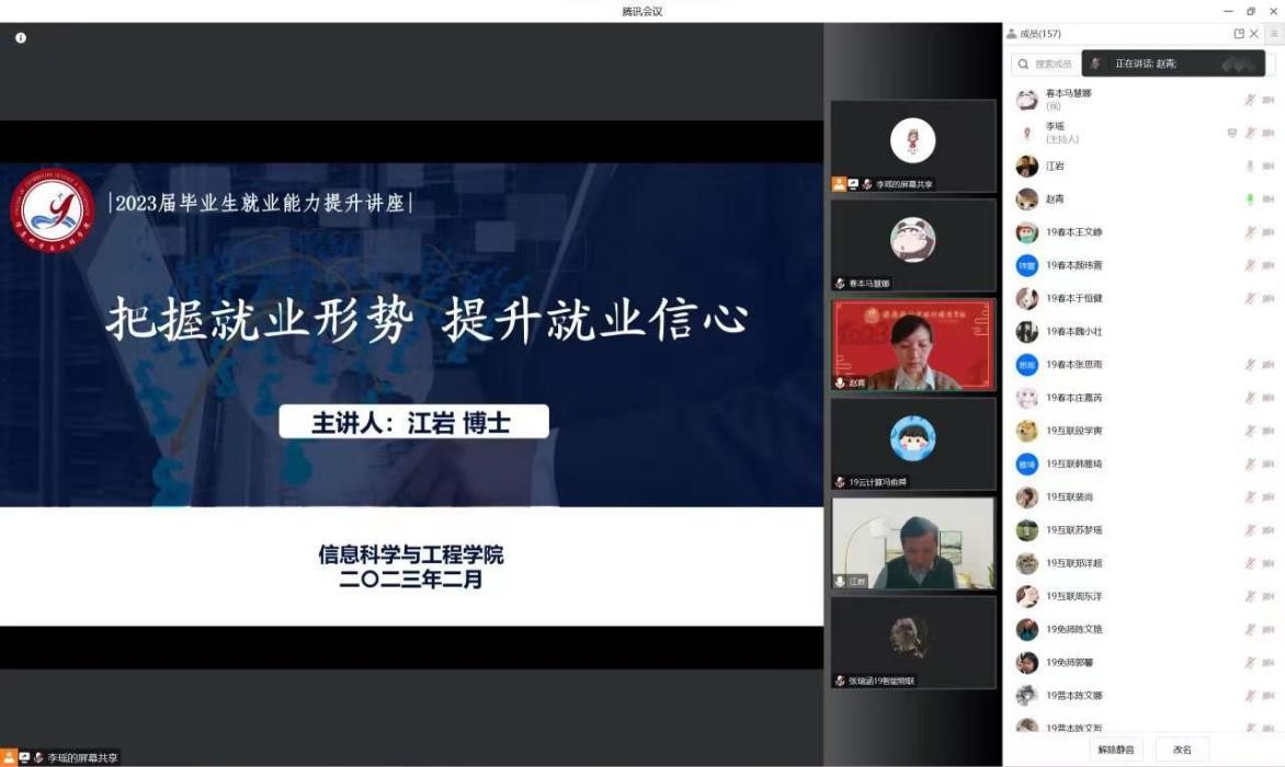 为推进2023届毕业生就业工作顺利进行,激发毕业生就业积极性,推动毕业生就业计划,提高毕业生就业率,2月7日,信息科学与工程学院邀请山东财经大学人才发展研究中心主任江岩教授,就“把握就业形势,提升就业信心”进行就业能力提升讲座。信息科学与工程学院党委书记赵青主持讲座,党委副书记梁晨、团总支书记李绚、毕业班辅导员及全体应届毕业生参加。