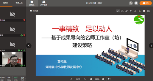 教育部“国培计划”专家、湖南省中小学教师发展中心黄佑生主任做了题为《一事精致足以动人——基于成果导向的名师工作室(坊)建设策略》的专题讲座。他从价值定位、工作逻辑、推进策略、建设原则、研训流程、成果产出等维度系统分析了工作室和工作坊的建设路径,提出了研究一个课题、带领一个团队、建构一个体系、研发一批课例、开发一批课程、建立一批基地、产出一批成果“七个一”的活动策略。