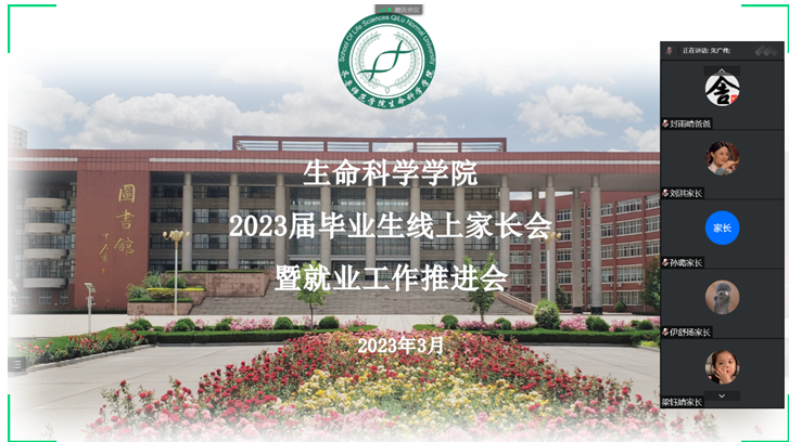 为深入学习贯彻党的二十大精神,落实上级“稳就业”“保就业”决策部署,抢抓春季开学后促就业工作关键期,全力促进2023届毕业生顺利就业、尽早就业, 3月10日,生命科学学院召开2023届毕业生线上家长会暨就业工作推进会,共同推动毕业生高质量就业工作。生命科学学院领导班子成员、2023届毕业班辅导员及全体毕业生家长参加会议。本次线上家长会由党委副书记朱广伟主持。