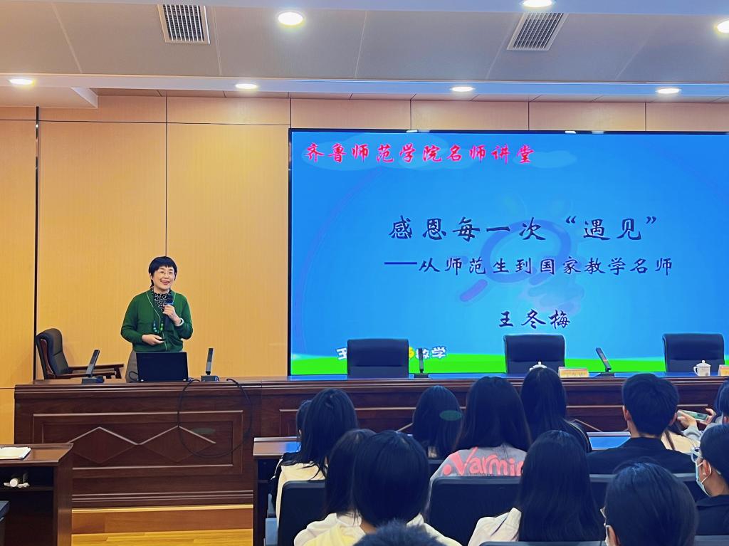 为深入推进学校师范生职前培养与职后培训一体化建设,推动职后培训实质与职前培养内涵深度融合,5月4日,“齐鲁名师大讲堂”第五讲在章丘校区A111报告厅开讲。本次讲座由“万人计划”国家教学名师、山东省第三届齐鲁名师、省特级教师、省教学能手、教育部“领航名师工作室”主持人王冬梅主讲,学校2022级师范类本科生线上线下同步参加学习。讲座由教务处处长张克玉主持。