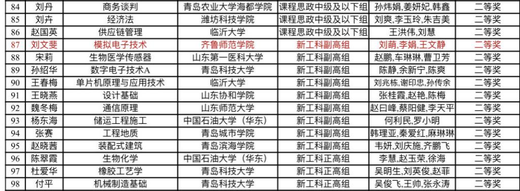 近日,山东省第三届高校教师教学创新大赛在山东师范大学长清湖校区落下帷幕,我校物理与电子工程学院教师刘文斐课程团队荣获新工科副高组二等奖。本次大赛历时近6个月,全省71所本科高校全部参赛。3500余支教师团队参加初赛,覆盖教师近万人。经选拔,共有465项作品入围省级大赛,144项作品进入现场决赛。
