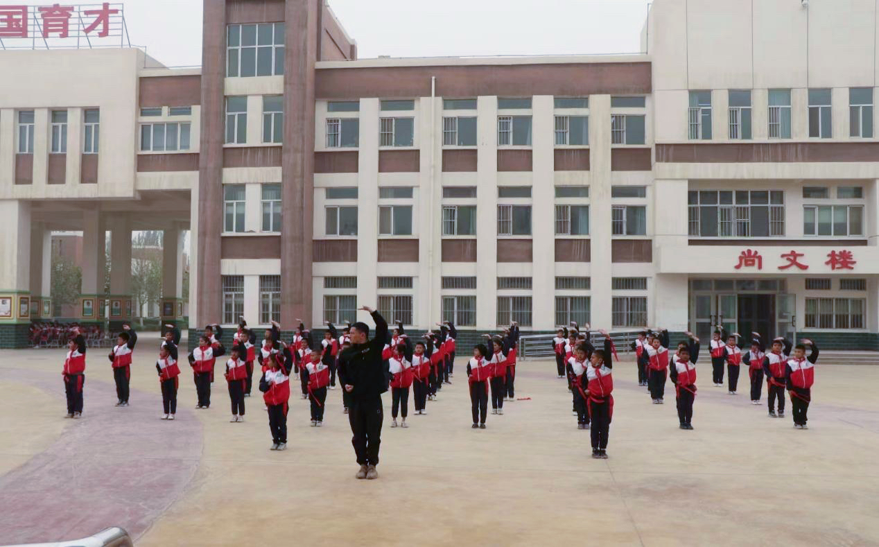 麦盖提县第六小学充分发挥课后服务的育人功能和价值,通过开设团体韵律操、乐高、手工、科学实验等各类特色活动,丰富学生的课后生活,提升学生的综合素养。作为齐鲁师范学院体育学院的一名学子,援疆支教团的陈仁义同学充分利用学校课后服务这一平台作用,将课后服务与武术育人进行有效衔接,成立武术社团,组建学习队伍,于每周五下午的课后服务时间,带领武术社团的孩子们一起进行武术训练。从武术的基本动作、三种手型以及五种步型基本功开始,带领学生们一步步练习,培养了学生们顽强的毅力与坚定的信念。