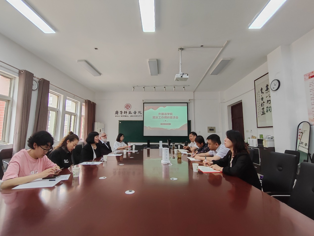 为全面提高人才培养能力,提升学生就业竞争力,推进主题教育走深走实,外国语学院于5月26日上午在学院会议室举行了两场用人单位调研座谈会,分别与山东圣劳伦斯国际教育培训有限公司、山东开泰集团有限公司、山东生晔磨球有限公司、济南增泰重工有限公司、济南新东方(国际教育)等5家企业开展座谈调研。学院党委书记于江、院长宋秀葵、党委副书记迟英娟、副院长谢士金、团总支书记牛荦参加座谈会。会议由迟英娟主持。