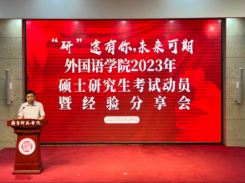 为进一步营造考研氛围,激发学生考研热情,明确考研目标,发挥考研“传帮带”作用,5月24日18:30,外国语学院“‘研’途有你,未来可期” 2023年硕士研究生考试动员暨经验分享会在章丘校区学术报告厅顺利举行。外国语学院党委书记于江、院长宋秀葵、党委副书记迟英娟、团总支书记牛荦出席会议,2020级全体本科生、2022级专升本本科班学生参加会议。会议由迟英娟主持。