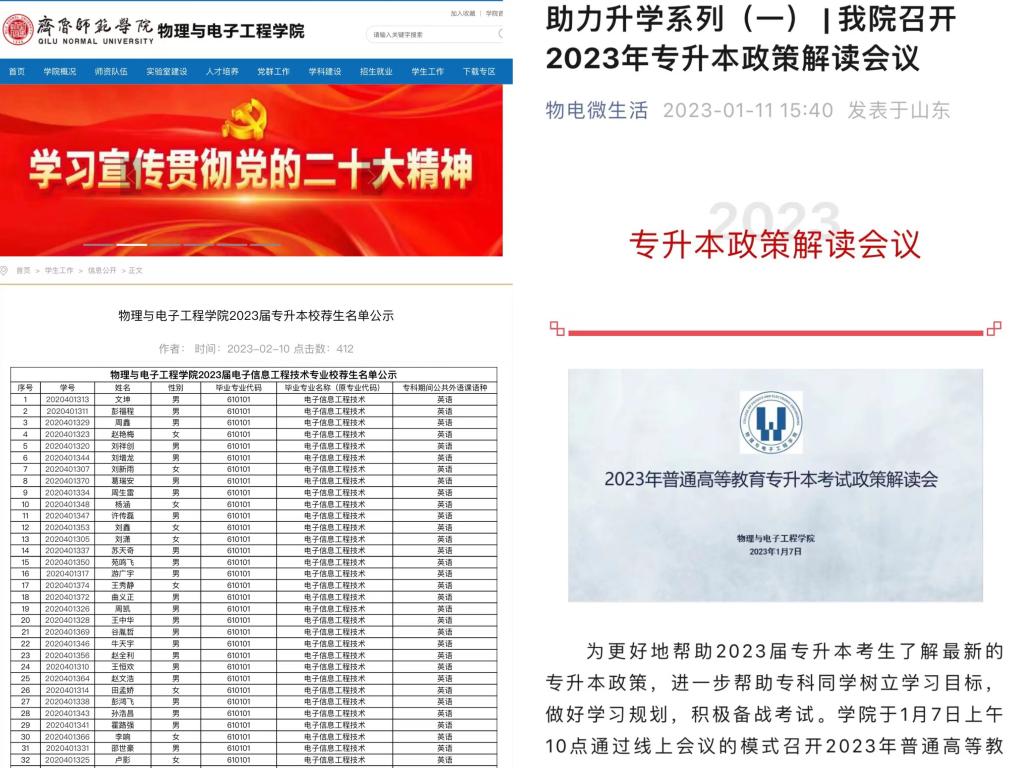 近日,2023年山东省普通高校专升本招生录取工作已落下帷幕,物理与电子工程学院2020级专科学子在本届专升本考试中取得佳绩。145名专科毕业生中,135名学生报考专升本,119名学生成功考取,录取率达82.06%,升学率达80%,创学院专升本历史新高。近年来,学院高度重视学生专升本工作,提前部署谋划,强化精准指导,积极动员备考,为学生升学提供了坚强保障。