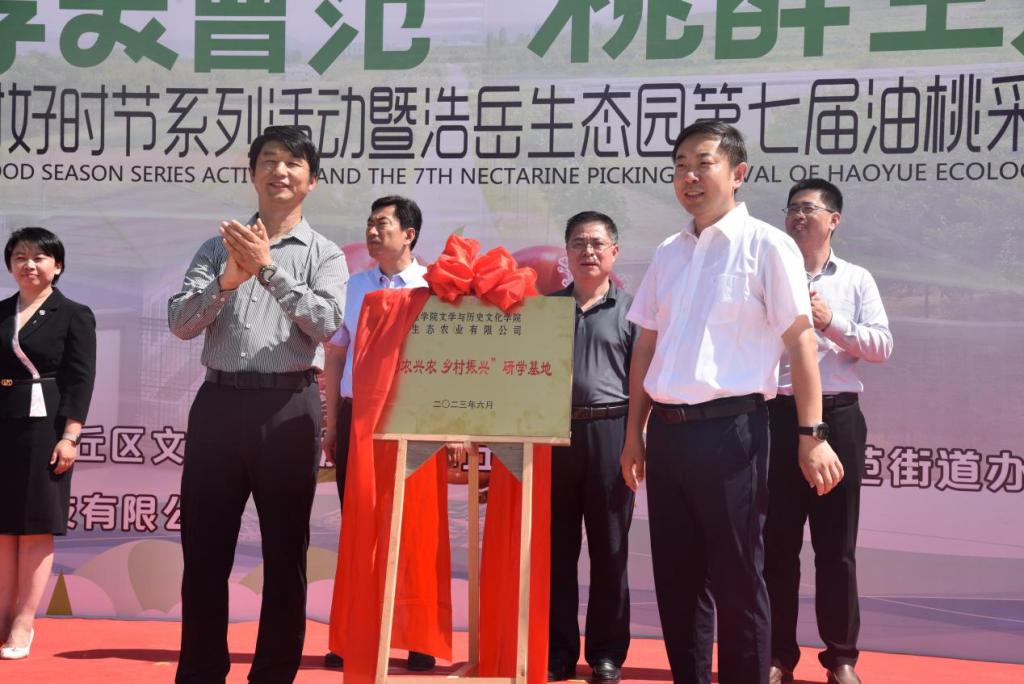 为深入开展学习贯彻习近平新时代中国特色社会主义思想主题教育,坚持党建引领,牢固树立立足地方、主动服务地方的意识,服务乡村振兴,深化校地合作发展,6月22日上午,文学与历史文化学院受邀参加章丘区曹范街道举行的2023年“乡村好时节”系列活动暨浩岳生态园第七届油桃采摘节启动仪式。