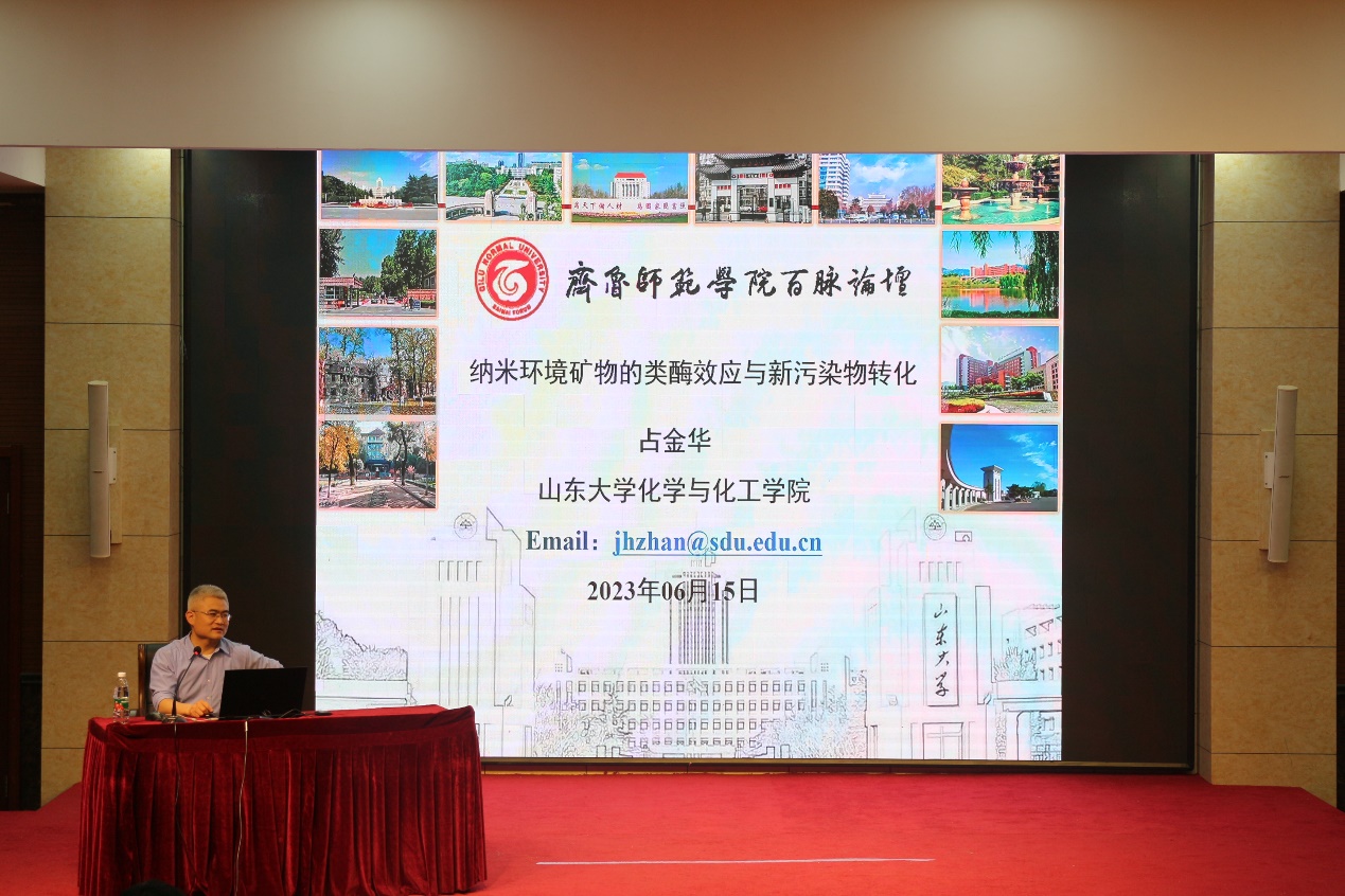 6月15日下午,由科研处主办、化学与化工学院承办的“百脉论坛”第八期讲座在章丘校区第一学术报告厅举行。山东大学化学与化工学院二级教授、博士生导师占金华作题为《纳米环境矿物的类酶效应与新污染物转化》的专家报告。论坛由化学与化工学院副教授刘新征主持,化学与化工学院部分师生现场聆听报告。