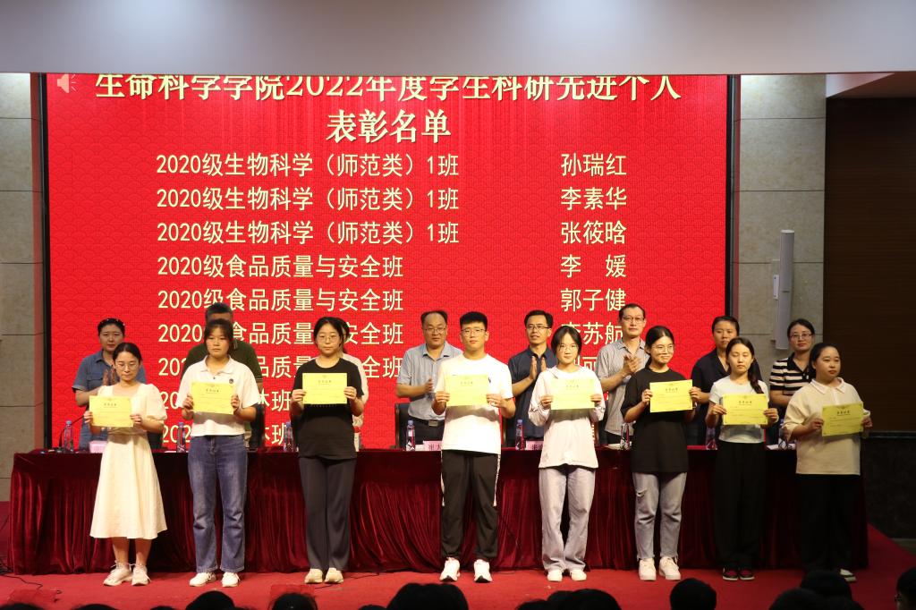 会上,张宏熙宣读了生命科学学院学习之星(学业类)、学习之星(综合类)、文体之星、科研先进个人等获得表彰的学生名单。在热烈的掌声中,学院领导班子为获奖学生颁发荣誉证书并合影留念。2020级生物科学专业的孙瑞红同学作为先进个人代表进行发言,她从学习规划、明确目标和大学收获三个方面分享了自己的感悟,并对学院提供的先进的科研平台和丰富的学习机会表达了真诚的感谢。