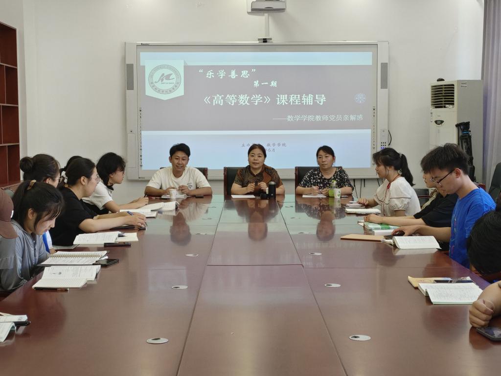 为深入开展学习贯彻习近平新时代中国特色社会主义思想主题教育,充分发挥共产党员的先锋模范作用和引领示范作用,6月30日下午,数学学院教师党支部在学院会议室开展了“‘乐学善思’——首期《高等数学》课程辅导”志愿服务活动。首期课程辅导由学院高庆玲、张珍、王家宁三位教师担任主辅导人,学校30余名学生前来咨询解惑。