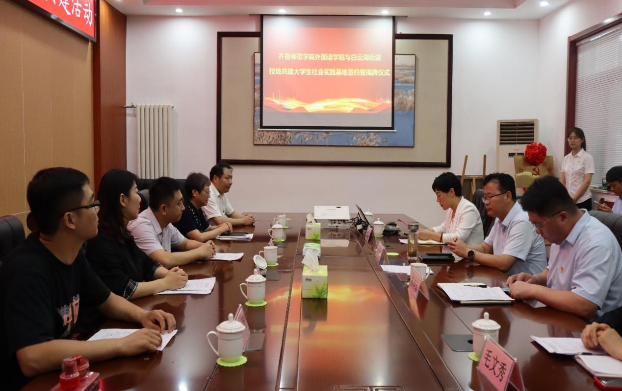 为推动学习贯彻习近平新时代中国特色社会主义思想主题教育走深走实,进一步强化党建引领,推进校地融合、双向共建,搭建大学生社会实践平台,7月13日上午,外国语学院与章丘区白云湖街道举行“党建共建暨大学生社会实践基地”签约揭牌仪式。外国语学院党委书记于江、院长宋秀葵,白云湖街道党工委书记袁致甲、办事处主任程涛远出席仪式。