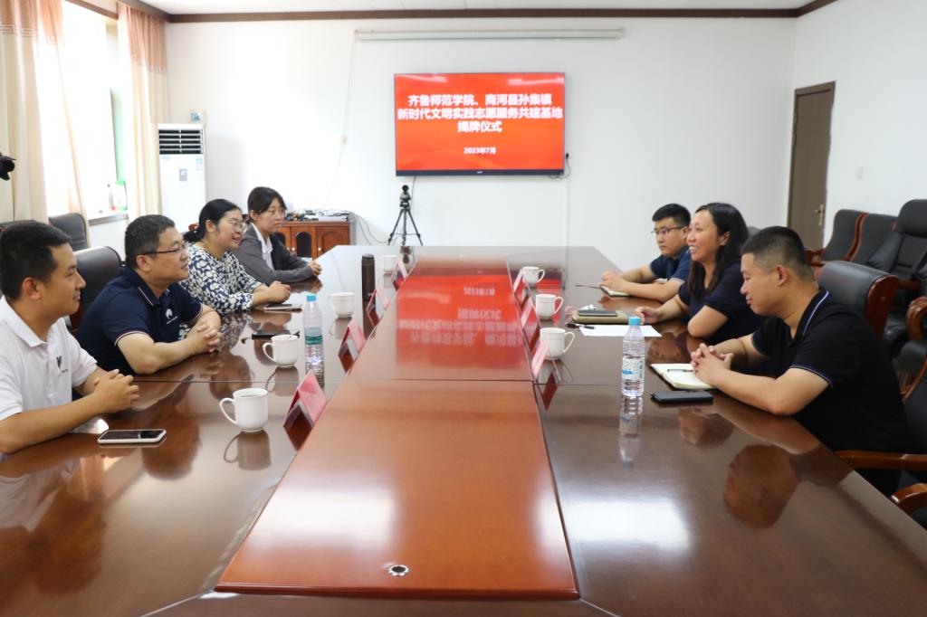 7月18日,齐鲁师范学院美术学院在商河县孙集镇人民政府会议室举行新时代文明实践志愿服务共建基地揭牌仪式。商河县孙集镇党委副书记、镇长戴慧英,党委副书记尹鑫泉,党委委员、组织委员张祥军;美术学院党委书记辛源,团总支书记邹少爽,辅导员孟令强、杨茜出席揭牌仪式。