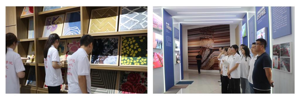 以人为本、薪火相传、弦歌不辍。伴随着淅淅沥沥的小雨,实践队来到了孙集镇地毯展馆参观非遗技艺。讲解员带领实践队队员们感受“地毯之乡”的发展历程,体会手工、机织地毯工艺,为非遗传承注入生生不息的青春力量。“一村一部人文史,千屋千张民俗图。”实践队走入南大刘村村史馆,感受乡村振兴的生动图景。围绕“历史文化”“环境位置”“家风家训”“留住乡愁”等主题,实践队队员们了解了600年来南大刘村人民的生活变迁,凝聚起了服务乡村振兴战略的坚定信念。