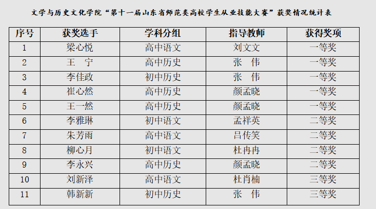 7月23日,由山东省教育厅主办,青岛大学承办的“第十一届山东省师范类高校学生从业技能大赛”省级决赛落下帷幕。经过激烈角逐,齐鲁师范学院文学与历史文化学院共获得一等奖5项,二等奖4项,三等奖2项。获奖层次和人数再创历史新高,相关学科获奖总数和奖项级别稳居全省前列。