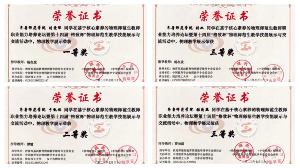 7月30日,全国第十四届“格致杯”物理师范生教学技能展示与交流活动在陕西理工大学举办,齐鲁师范学院物理与电子工程学院通过前期培训、选拔,派出4名学生参赛,同来自北京师范大学、华中师范大学等101所高校的1200多名选手同台竞技。经过激烈角逐,最终学院学生刘爱琛获一等奖,于凯琳获二等奖,张清照和张双分获三等奖。