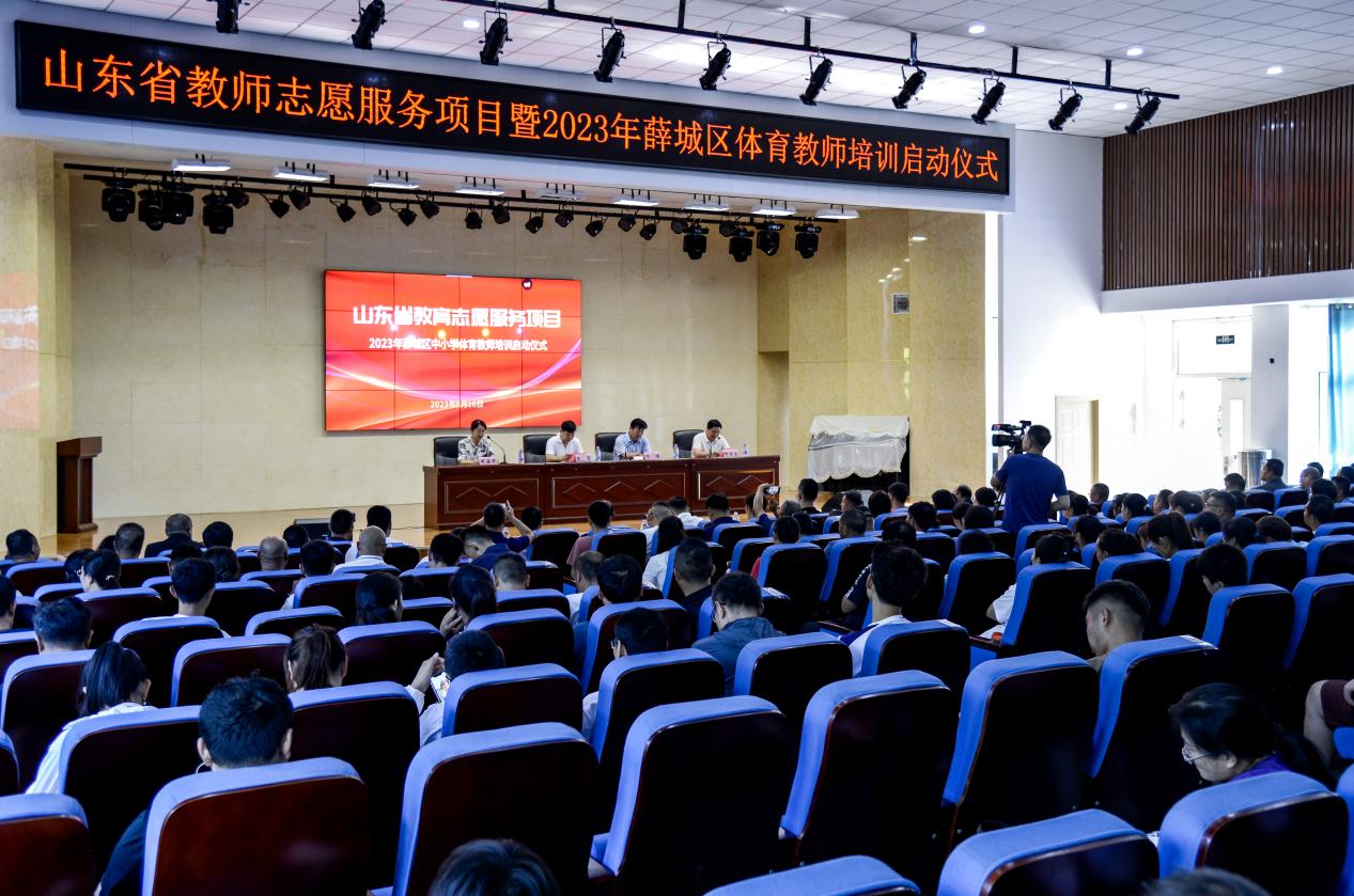 为进一步贯彻落实山东省教育厅关于组织实施山东省志愿服务项目通知文件精神,提高项目县区学科教师教学能力,8月16 日,山东省教育志愿服务项目暨薛城区中小学体育教师培训启动仪式在枣庄市薛城区举行。枣庄市教育局党组成员、教科院院长邓淇,薛城区副区长周海燕,齐鲁师范学院体育学院副院长张雷以及枣庄市各相关市区科室负责同志和薛城区内全体体育学科教师代表共计260余人参加仪式。启动仪式由薛城区区委教育工委常务副书记、教体局党组书记、局长种法立主持。