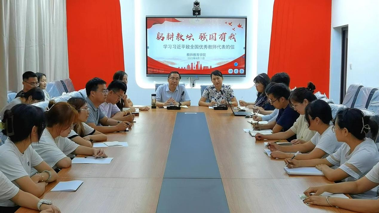 9月11日,教师教育学院组织召开“躬耕教坛、强国有我”学习习近平总书记致信全国优秀教师代表精神师生座谈会。会议由学院党委书记姜东菲主持,学院领导班子、辅导员、教师及学生代表共30余人参加。