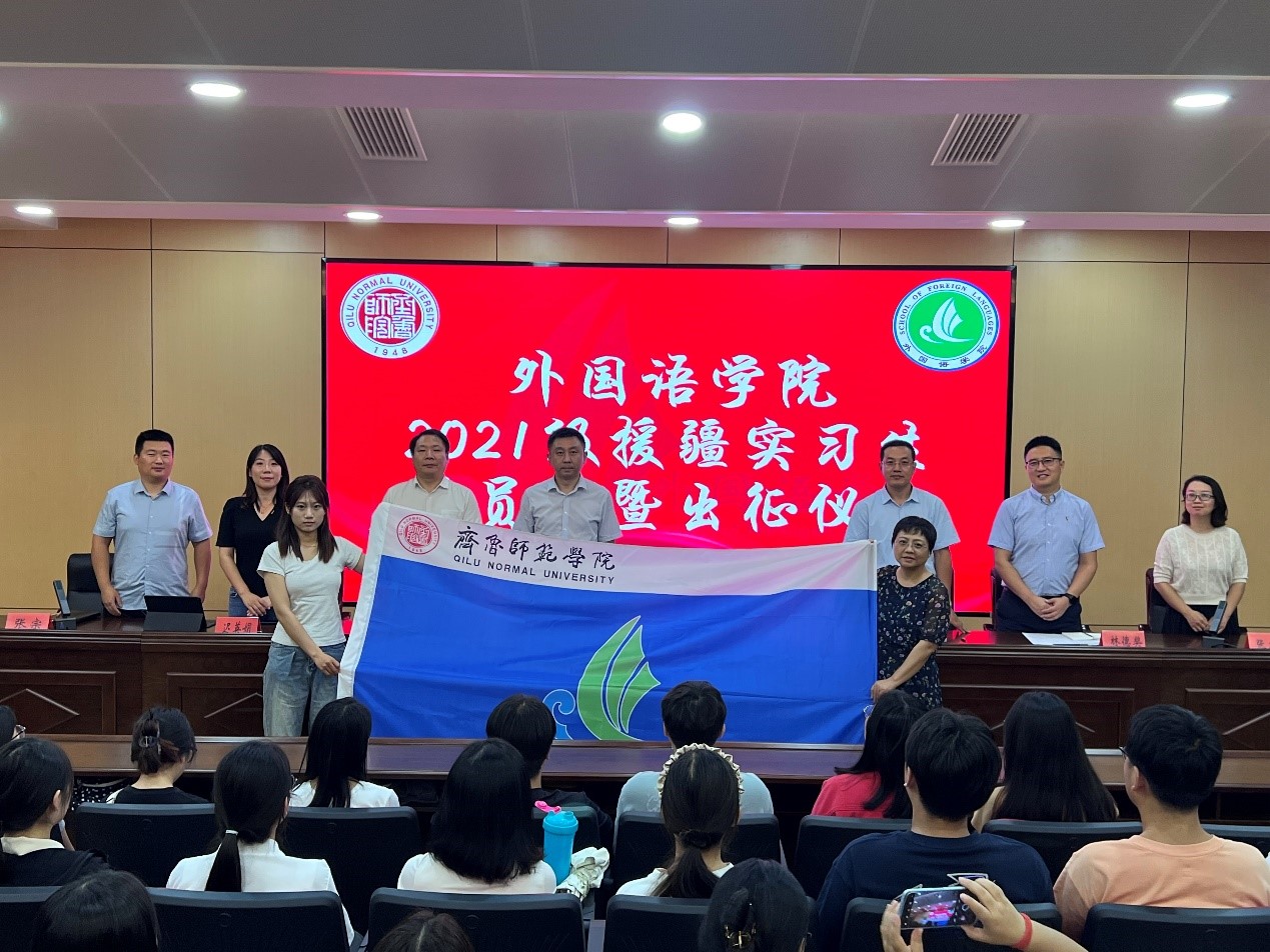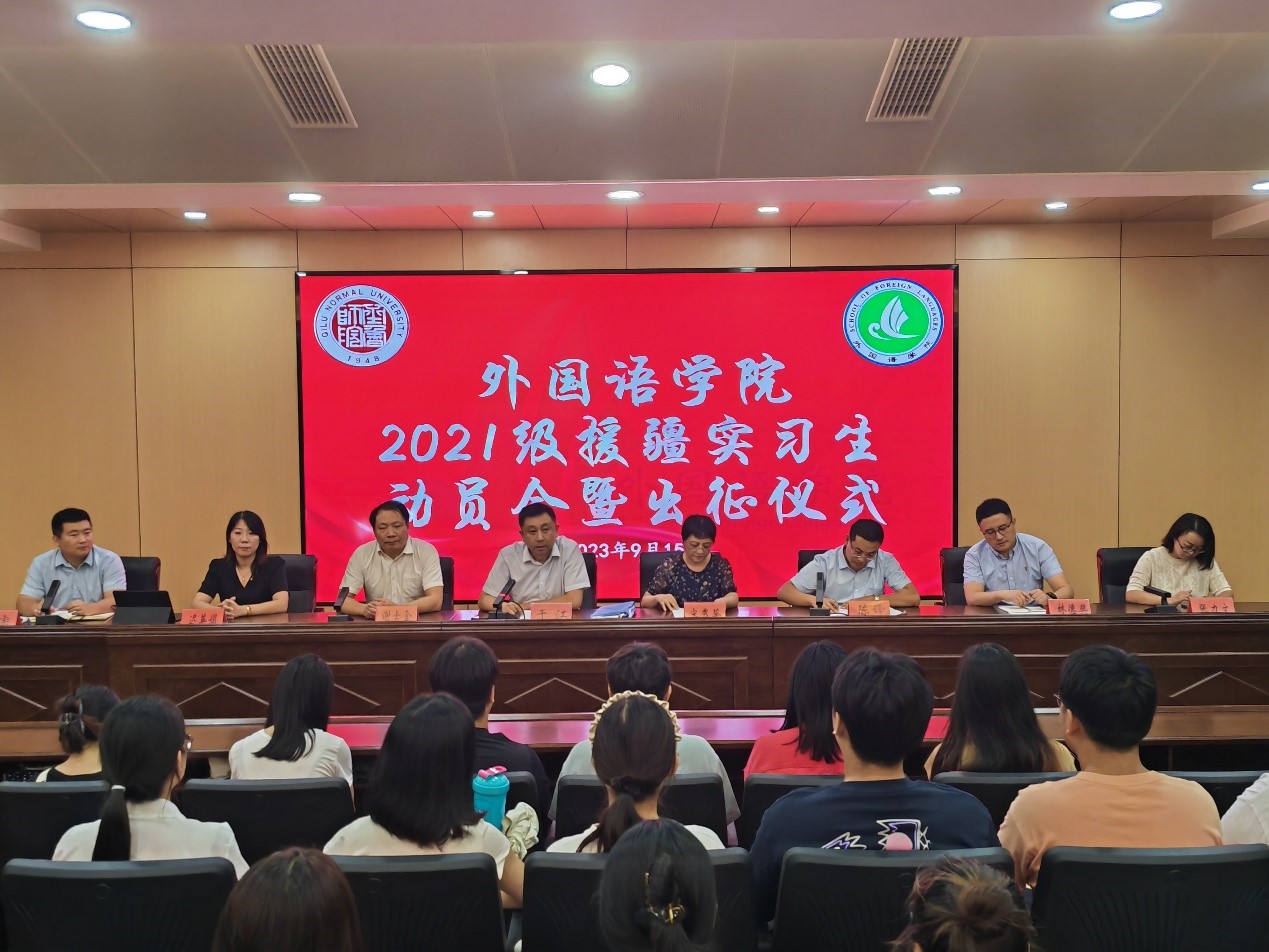 为提高学生对毕业教育实习的认识水平,充分了解援疆实习的重大意义,增强援疆实习工作的信心,顺利实施支教活动并切实取得实习成效,根据学校工作要求,外国语学院于9月15日下午在章丘校区第二会议室举行2021级援疆实习学生动员会暨授旗仪式。外国语学院班子成员、实习指导教师、教师代表出席会议。会议由副院长陈锋主持,40名赴新疆实习的学生参加会议。