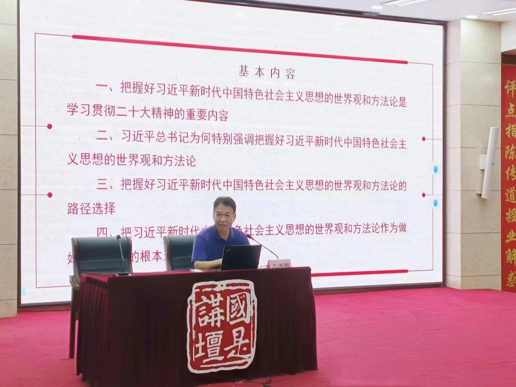 10月12日,“国是讲坛”第65期学术报告会在学校章丘校区第一学术报告厅举办。学校优秀校友、特聘教授、济南大学新时代中国特色社会主义研究中心主任文洪朝教授应邀作题为《学习和把握习近平新时代中国特色社会主义思想的世界观和方法论》的报告。马克思主义学院副院长刘煜昊主持报告会,马克思主义学院全体思政课教师及学生聆听报告。