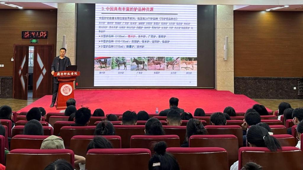 报告会上,王长法从产业角度向大家介绍了我国及世界驴业的发展现状,对驴育种与繁殖方面面临的主要问题进行了分析,讲解了我国驴产业“活体循环开发”的系统模式;从科学研究角度系统地介绍了关于驴的若干个重要科学问题,对驴的种质资源挖掘、驴基因组及重测序研究、驴起源驯化溯源等的科研探索进行了生动详实的阐述。在此基础上,他介绍了其团队获得世界首个组装到染色体水平的家驴基因组参考图谱的情况,以及对所得大数据进行深度挖掘、揭示四大洲地方驴品种间的特征性分子差异、明确驴特有基因序列、为真假驴皮及阿胶的鉴别诊断提供分子依据等的研究进展;并对家驴驯化过程中严重的性别偏倚现象以及毛色驯化与未来品种培育相关性的理论依据等科研进展进行了分享。