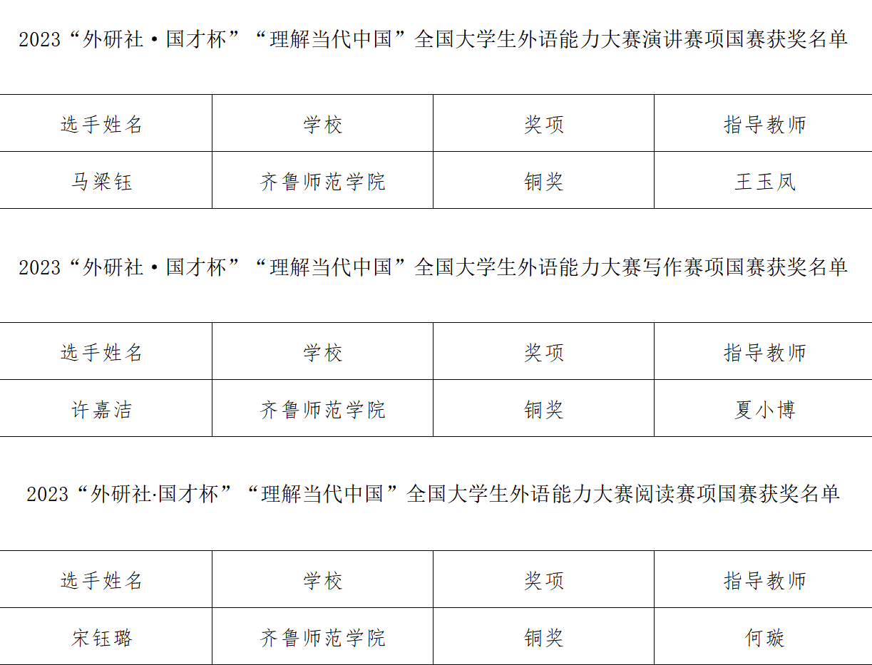 12月5日,2023“外研社·国才杯”“理解当代中国”全国大学生外语能力大赛(英语组)国赛各分赛赛事圆满落幕,齐鲁师范学院外国语学院学生马梁钰、许嘉洁、宋钰璐与来自全国各大高校近2000名选手同台竞技,分别斩获英语演讲赛项国赛铜奖1项、写作赛项国赛铜奖1项、阅读赛项国赛铜奖1项的佳绩。这是三位选手继在代表学校实现首次闯入该类赛事国赛后,又一举拿下其中三类竞赛奖项,实现学校在该类竞赛的历史性突破。