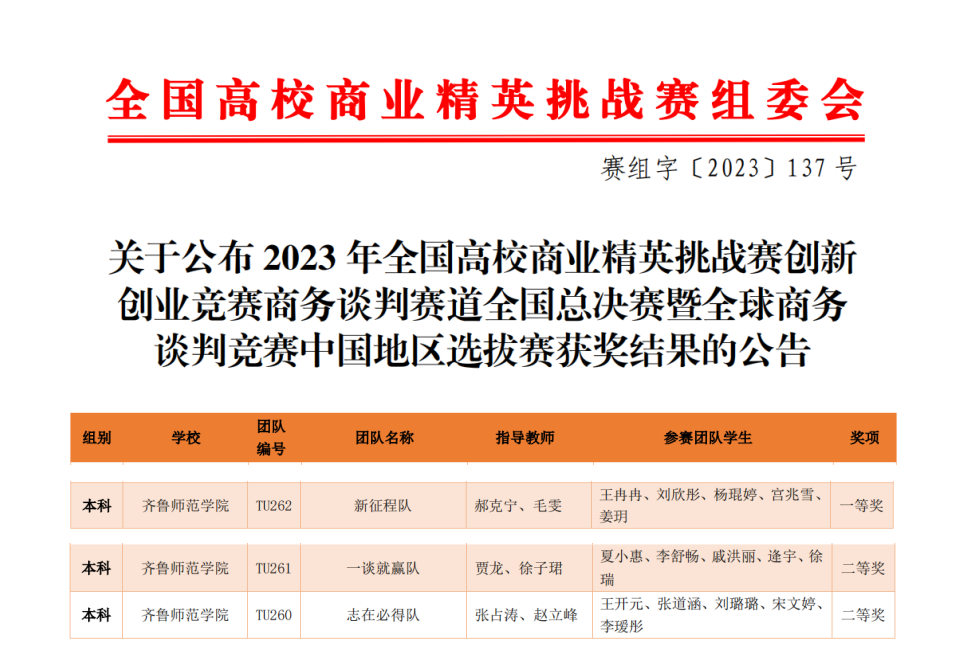 近日,2023年全国高校商业精英挑战赛创新创业竞赛商务谈判赛道全国总决赛成功举办,齐鲁师范学院马克思主义学院学生经过激烈角逐,从5000名学生800支参赛队伍中脱颖而出,在全国总决赛中斩获一等奖一项、二等奖两项。