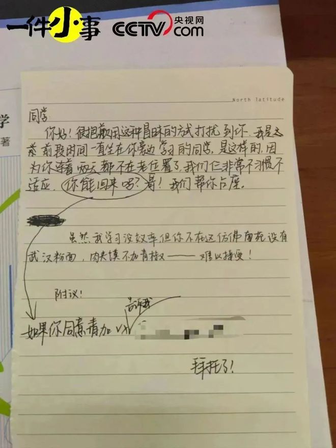 突然有一天,安静哥没有出现,其他人坐了过来,这让她们很不习惯。“那个同学身上有很重的烟味,喜欢摔笔大声叹气。”过了好几天,她们也没等到安静哥的回归,于是决定主动去找他。好在安静哥只是换了个位置坐,她们写了一张纸条,鼓起勇气送到安静哥手上。