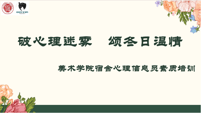为提升宿舍心理健康信息员的朋辈服务技能,促进学院心理健康工作开展,营造良好的宿舍氛围,齐鲁师范学院美术学院于12月13日晚在327教室开展了“破心理迷雾,颂冬日温情”——2023级宿舍心理信息员素质培训会议。会议由学院辅导员刘婷及心理发展部王乐涵、康芙瑞主讲。