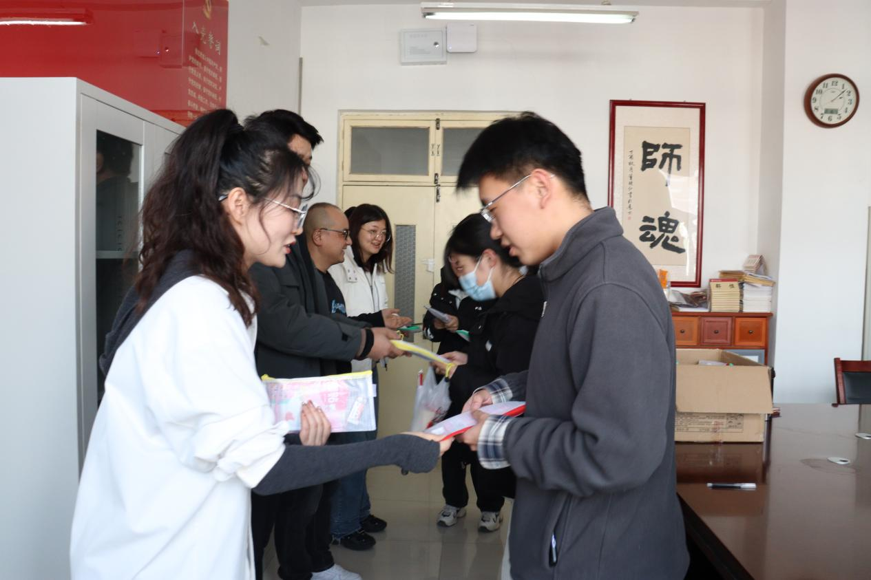 随后,学院为考研学生送上了精心准备的考研助力大礼包,向同学们表达了研路逐梦、顺利上岸的美好祝愿。考研学生向领导老师的关心祝福表示感谢,并表示会抓住剩下的时间坚持到底。低年级学生代表也表示会以学长学姐为榜样,希望学长学姐坚定信念,勇敢面对挑战。